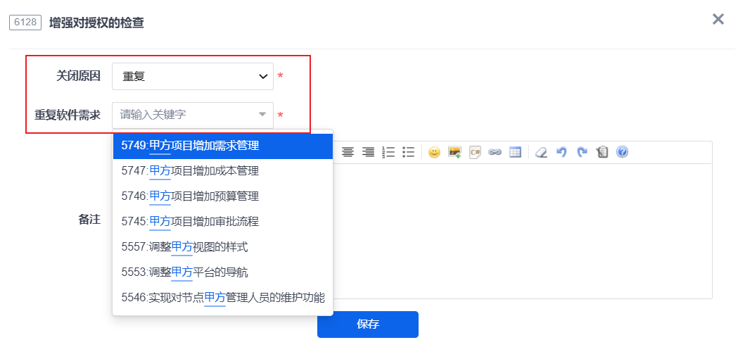 - 关闭需求和解决Bug时,填写重复需求或Bug支持模糊搜索。