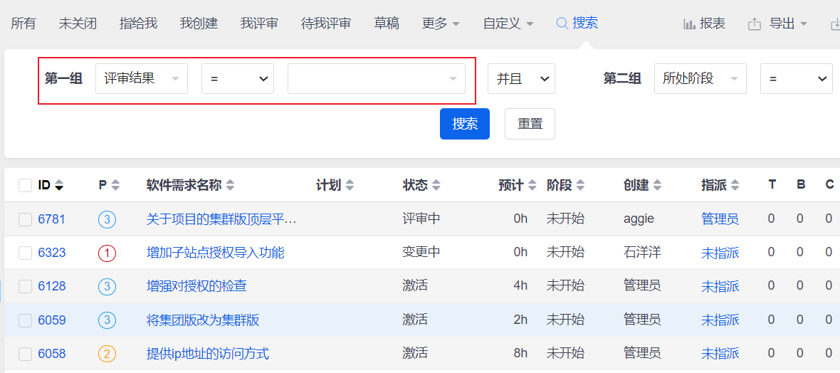 ▼ 研发需求搜索表单增加评审结果字段,您可以根据评审结果快速查找需求。