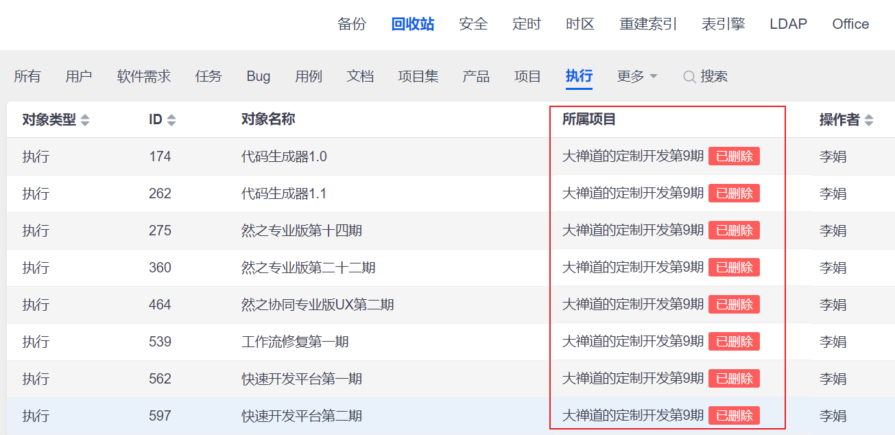 ▼ 回收站的执行、需求、任务列表中分别增加所属项目、所属产品、所属执行字段,您需要恢复对象时,可以查看对应的所属关系和上一层级的状态,方便您操作。