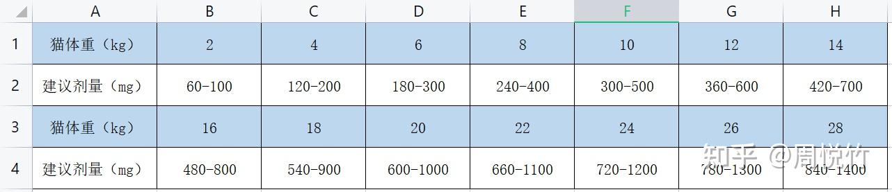 补充一张喂食猫咪鱼油剂量的表格: